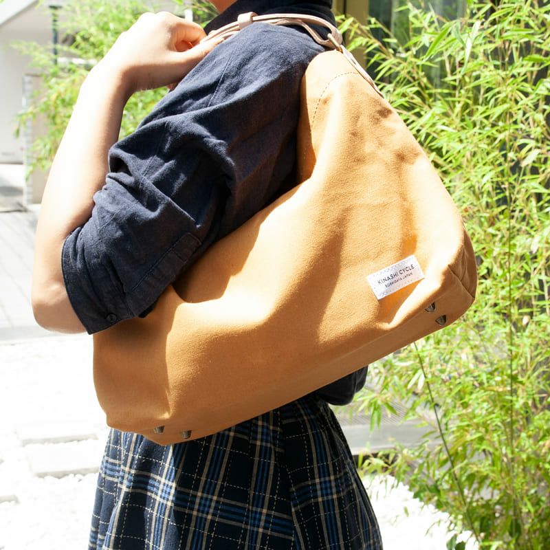 自立するしっかりさを持ちながら、肩に掛けた時に体に馴染む柔らかさのあるリネン帆布ならではの生地感が特徴です。