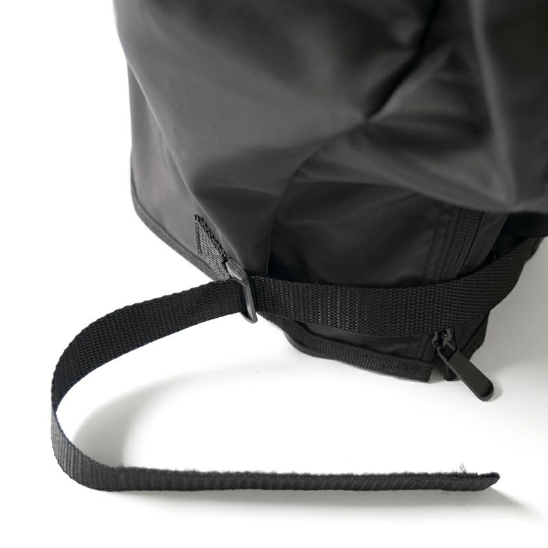 配送時に伝票を入れるクリアスリットや、コンパクトに丸めてとめられるゴムバンドを装備しており、ハンドル部分と底部分はベルクロテープで固定が可能です。