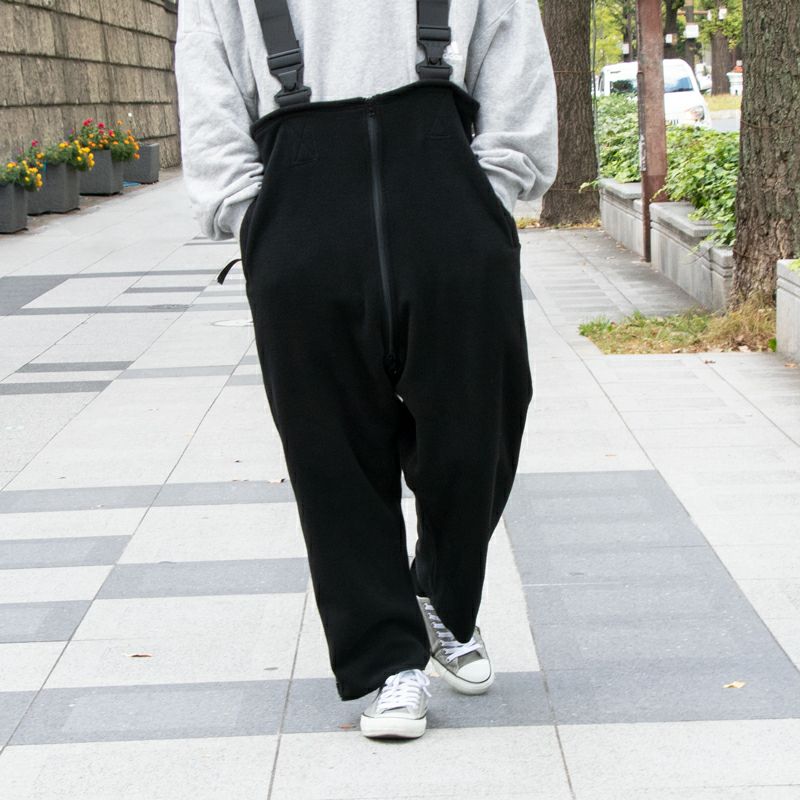 ミリタリーのオーバーオールをベースにしており、靴を履いたまま脱着するための両サイドのファスナーや肩ベルトの独特なバックルパーツなど面白いディティールが特徴です。