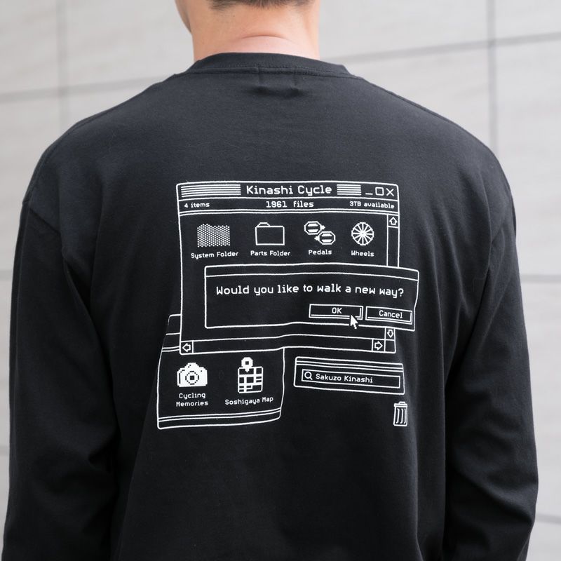胸元のロゴは伝説のPCをオマージュ。バックは懐かしのレトロサイバーなデザインをプリントしました。