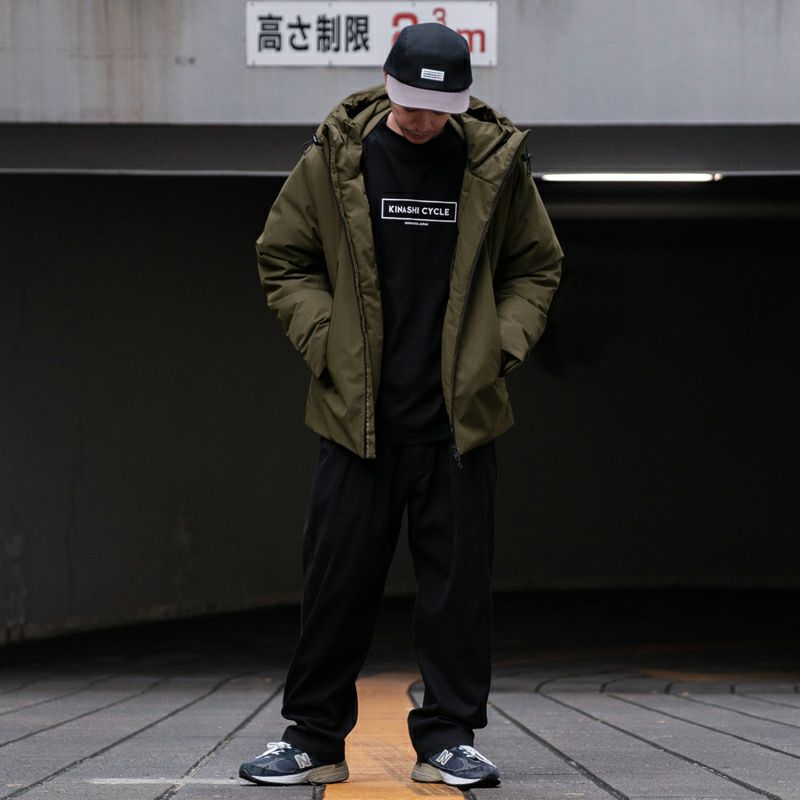 撥水加工を施したポリエステル生地を使用し、胸元にはワッペン、右肩の後ろにロゴプリントをのせスリムなデザインに。