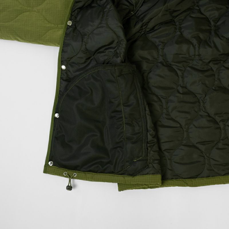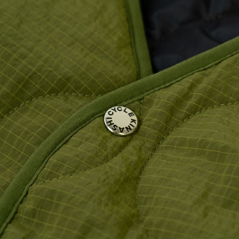 裾はドローコードでサイズ調整が可能。ポケットはワイドな作りで出し入れしやすく、ボタンは「KINASHICYCLE」の刻印入り◎