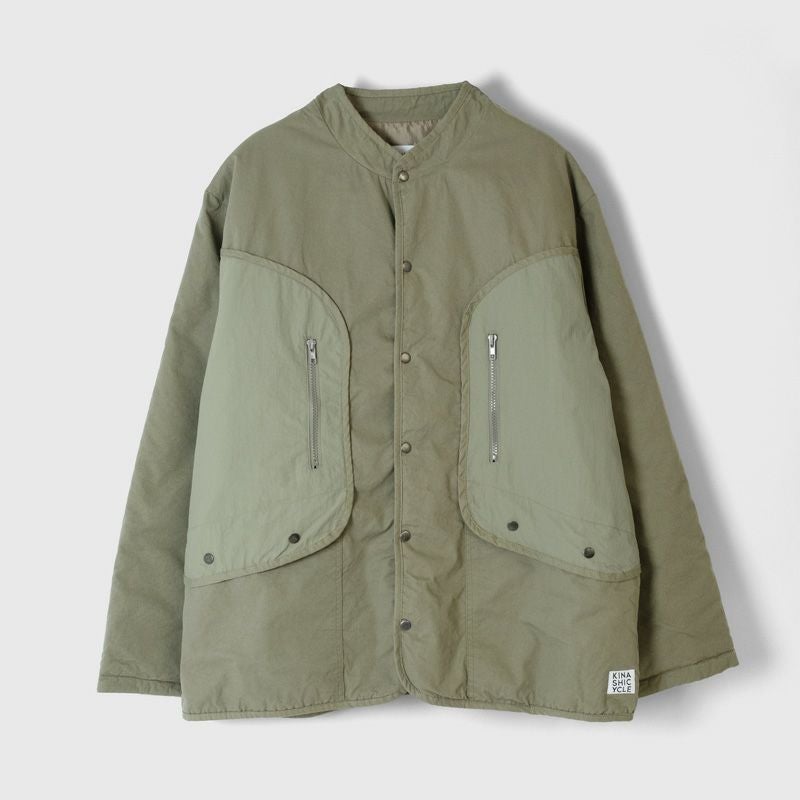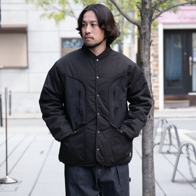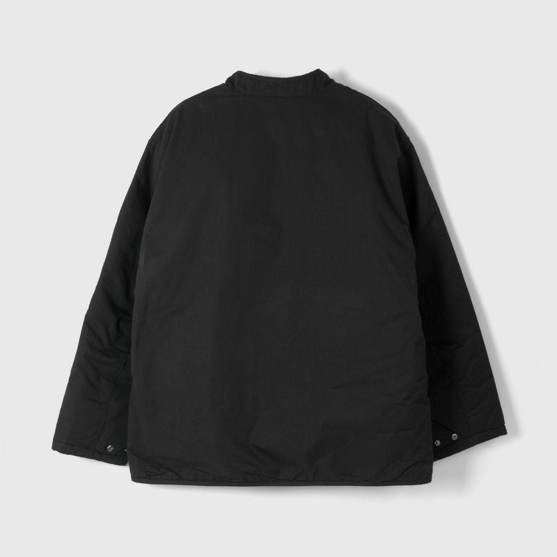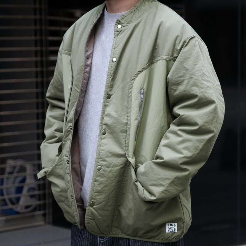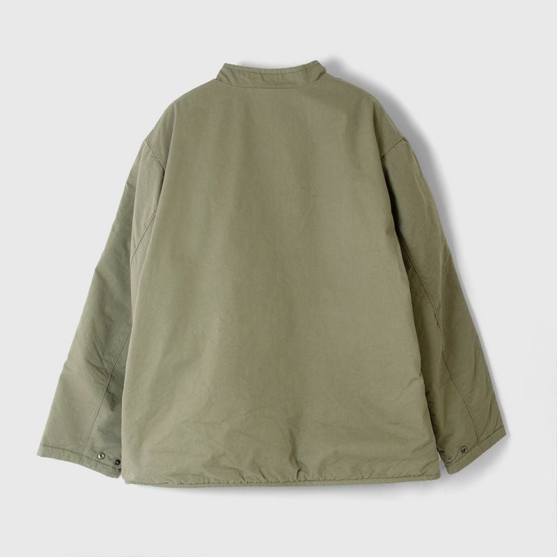 ゆとりある身幅とスッキリとした着丈のシルエット。生地は薄手ながら中綿入りで、肌寒い季節の羽織にぴったりな一着です。