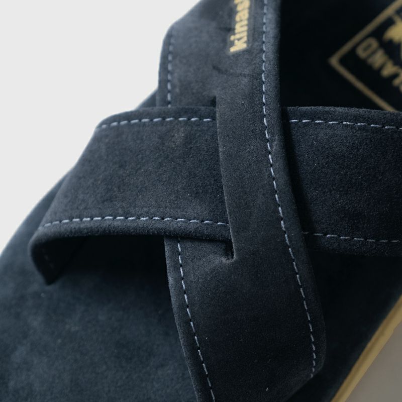 レザースウェード生地にゴールドのロゴをオンしたシンプルなデザイン。足裏のクッションがフィットして、柔らかで快適な履き心地です。甲でストラップがクロスしたシンプルなデザインは裸足はもちろん、ソックスとの相性も良く1点1点ハワイの職人の手で作り上げたこのサンダルは長く着用いただける1足です。