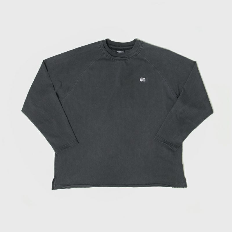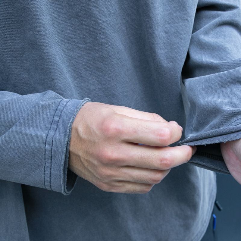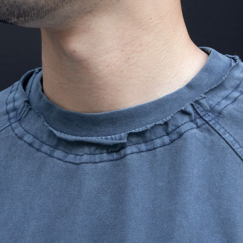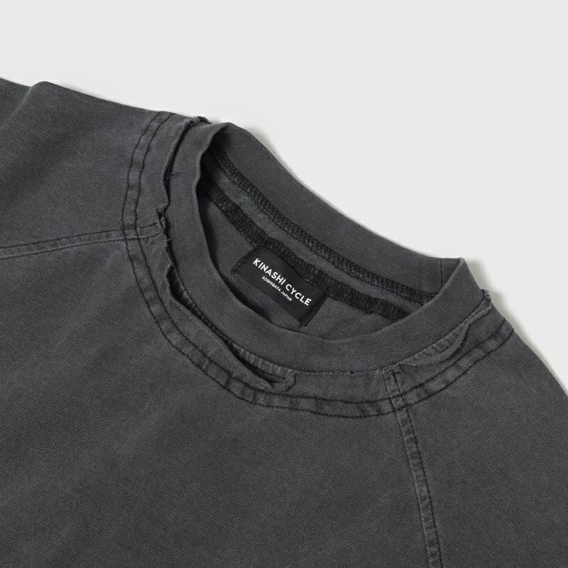 裾と袖口はカットオフし、首元はカットオフしてさらにリブを取り付けたようなデザインになります。