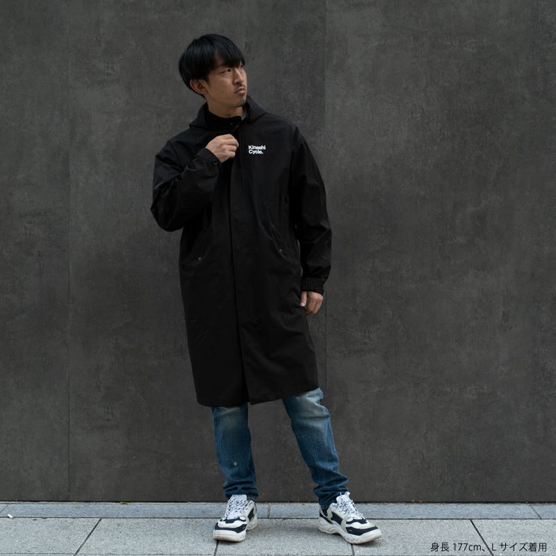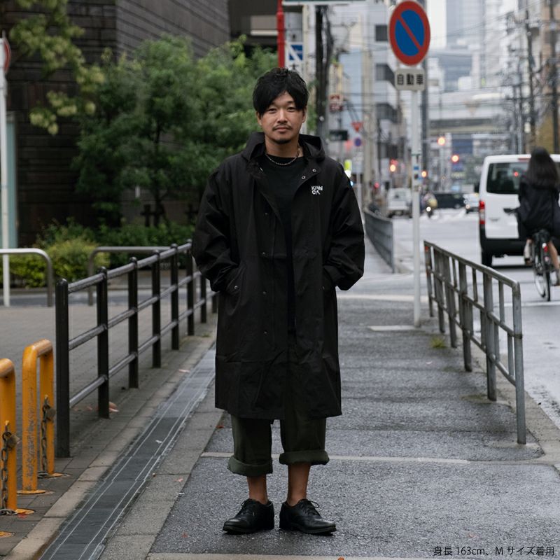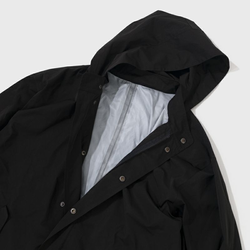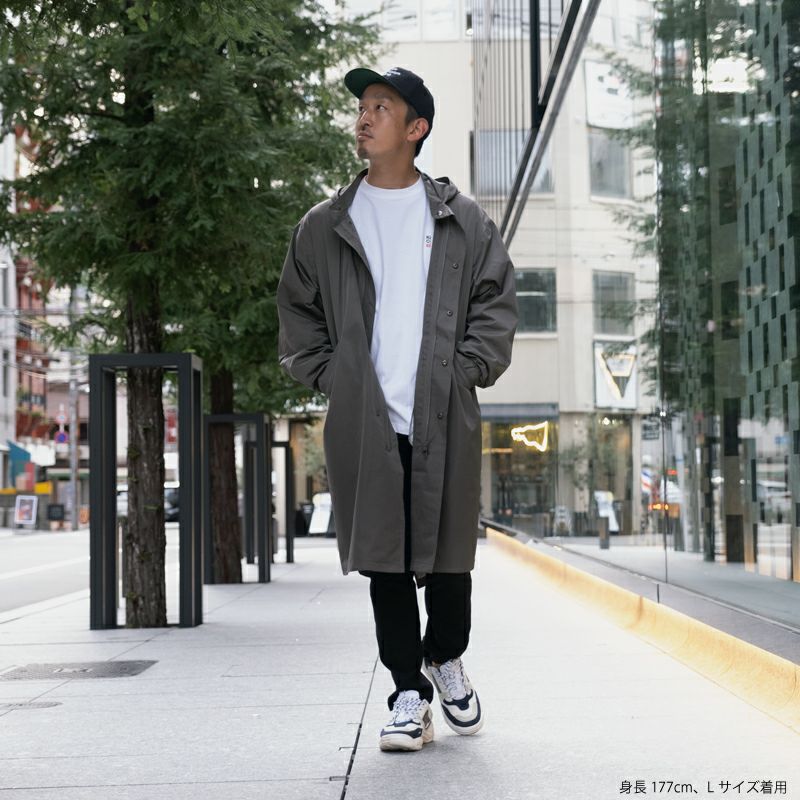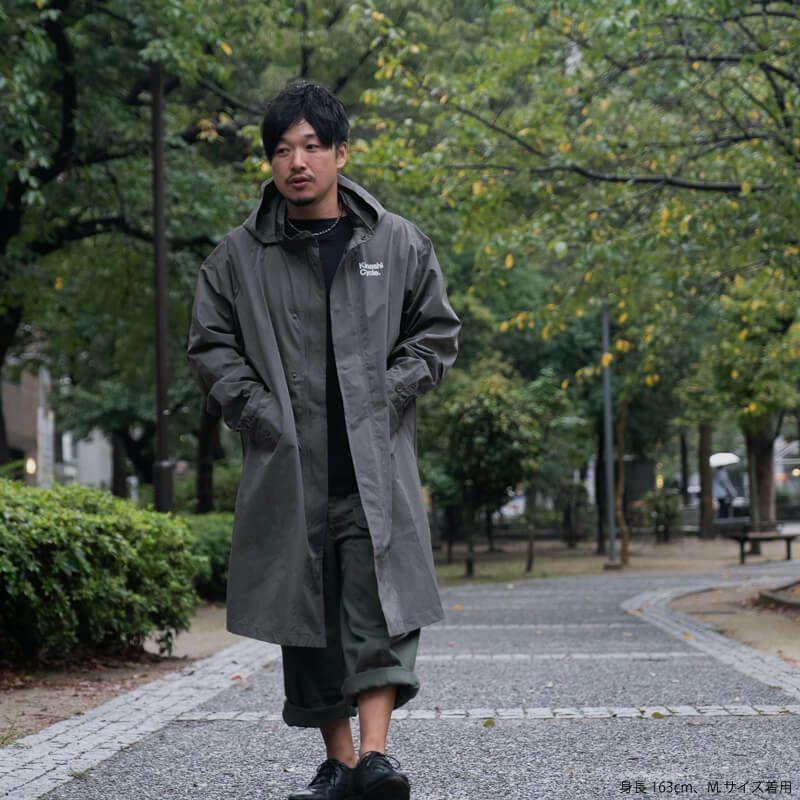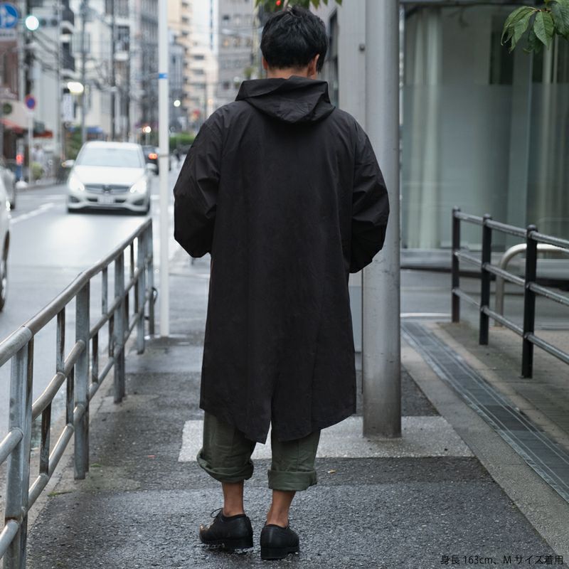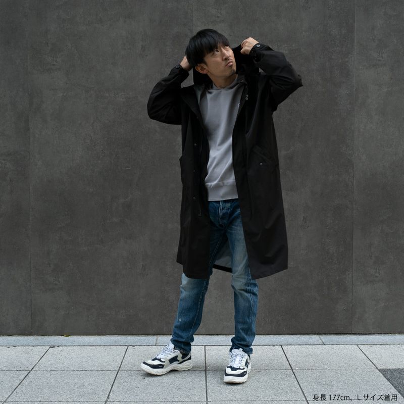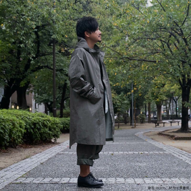 形をレインコートっぽくならないよう、モッズコートの形をベースに仕上げました。通常のレインコートに比べ身幅を狭くすることでタウンユースでも使いやすく、カジュアルスタイル、キレイ目スタイルまで幅広いコーディネートに合わせられる一着です。表生地の撥水はもちろん、内側の縫製箇所にシームテープを施しているので多少の雨でも安心。
