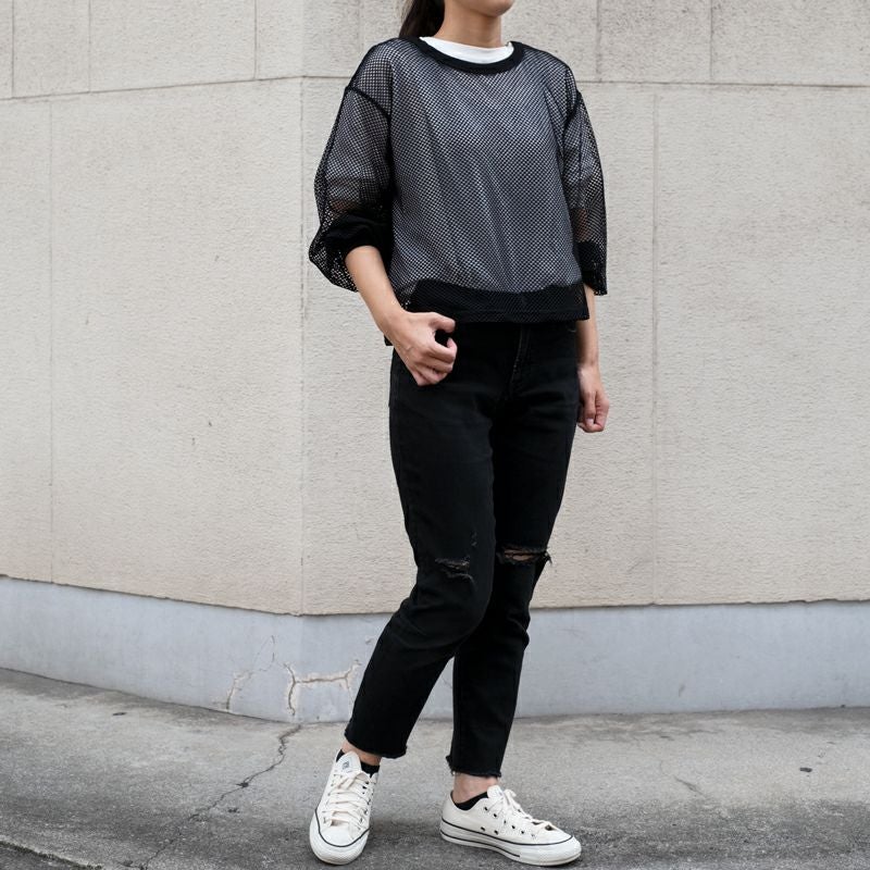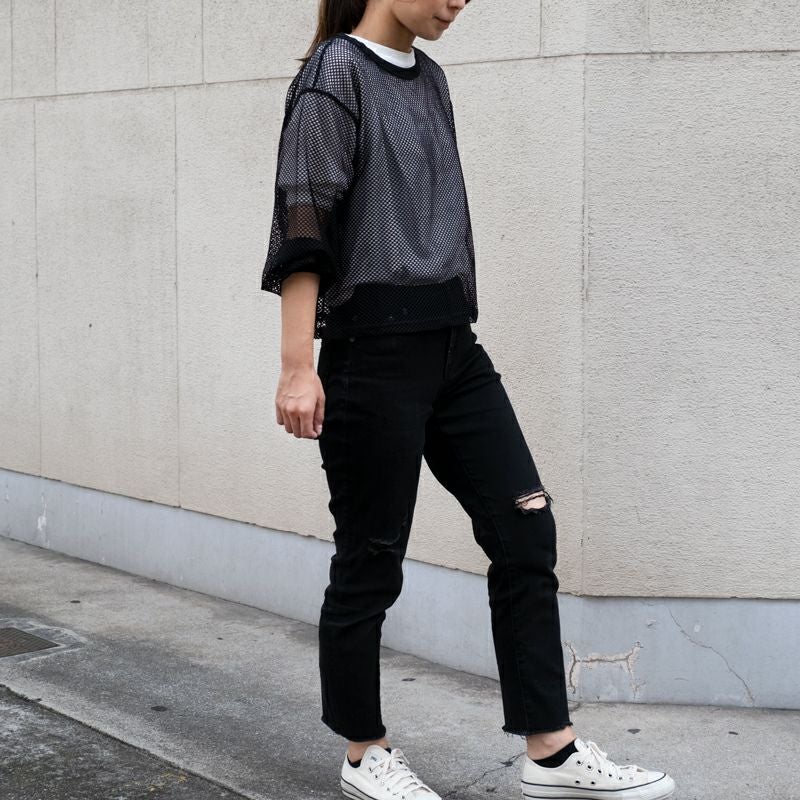 メッシュの透け感を活かし、レイヤードを楽しめます。