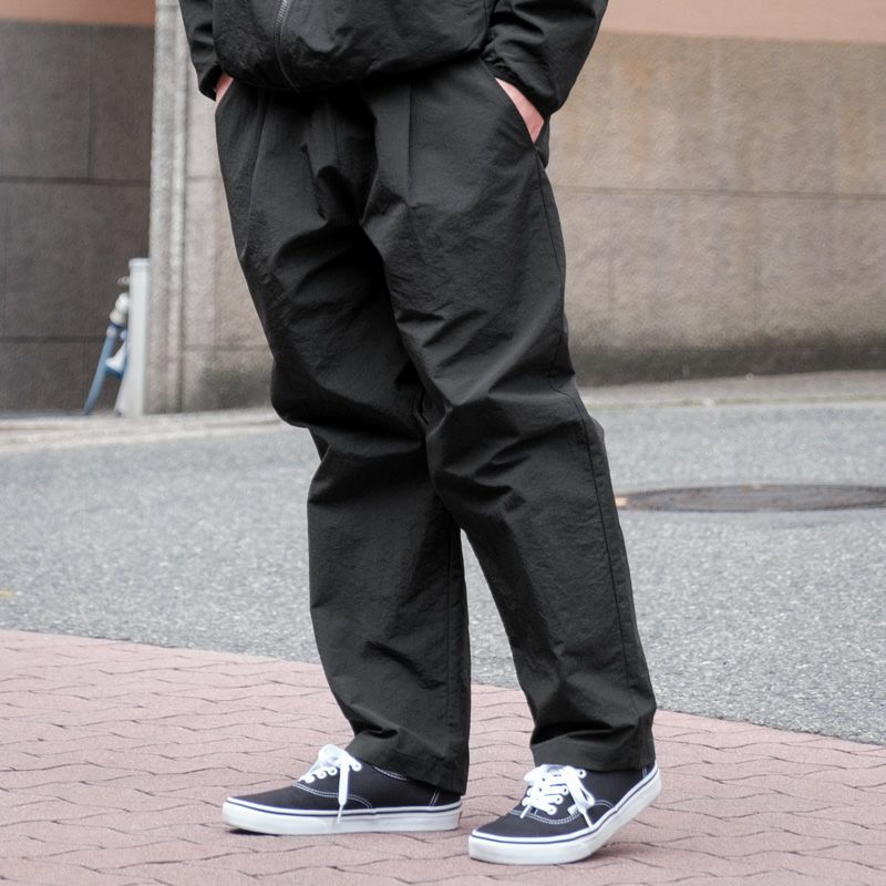パンツはウエストにタックを施しゆとりのあるワタリから裾に向かってテーパードを利かせた設計で、ボリュームのあるフォルムながら足下がバランス良く収まるデザインに。タックが入っているのでベルトループにベルトを通しても着用頂けます。