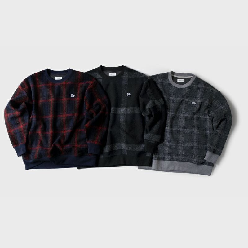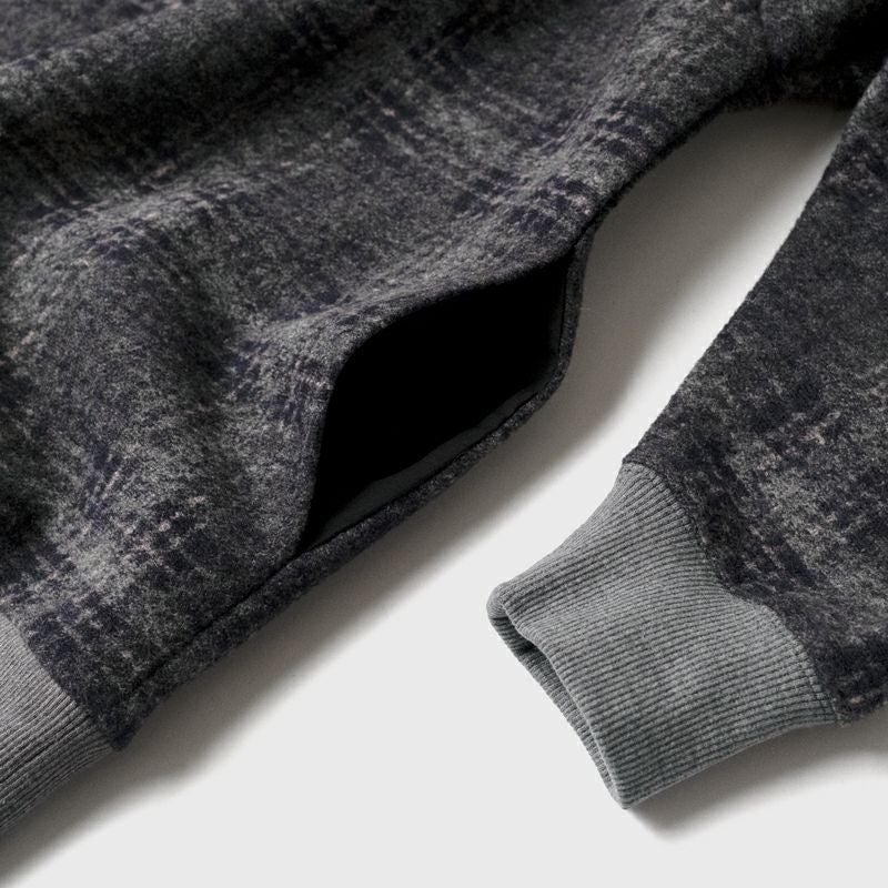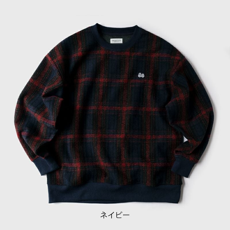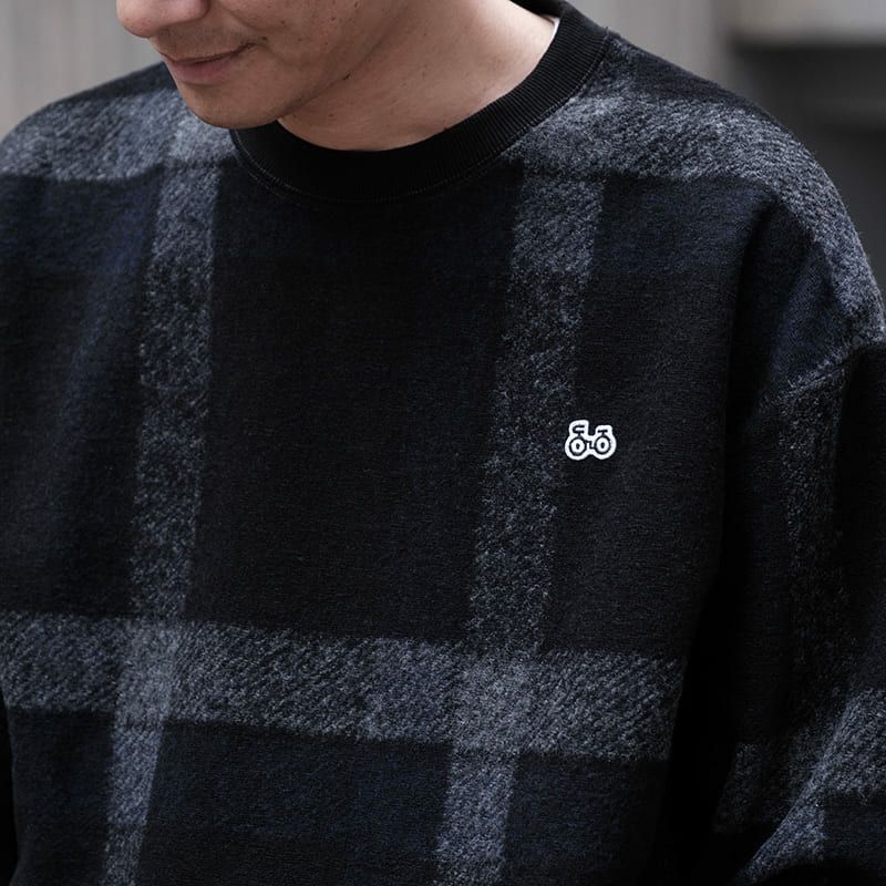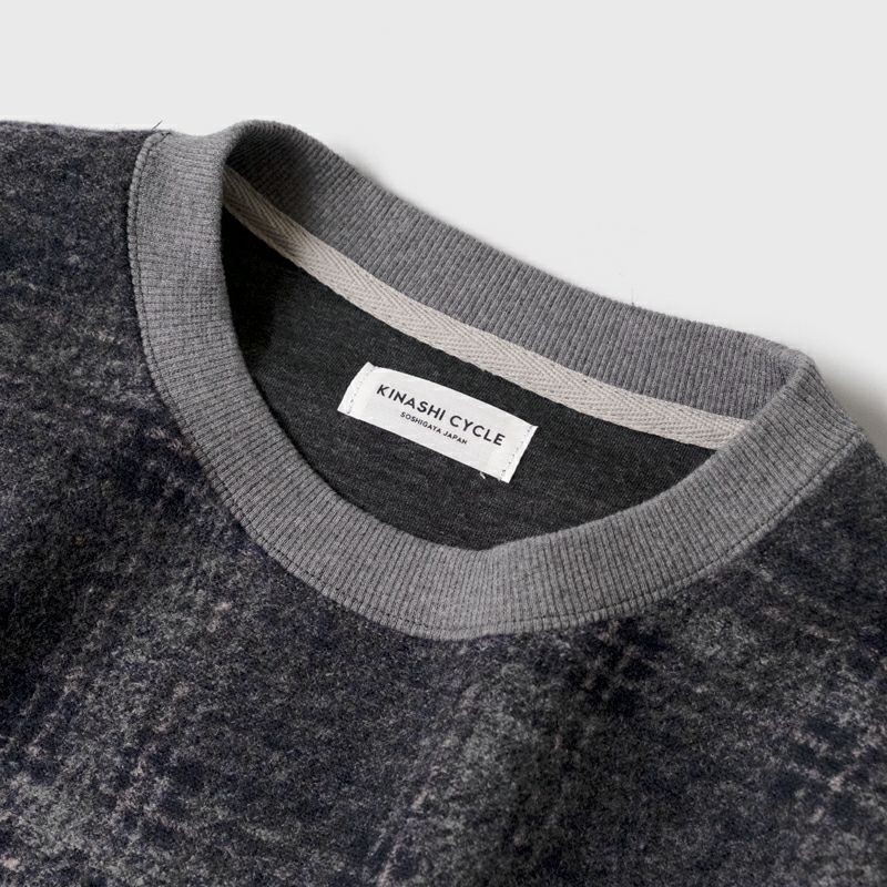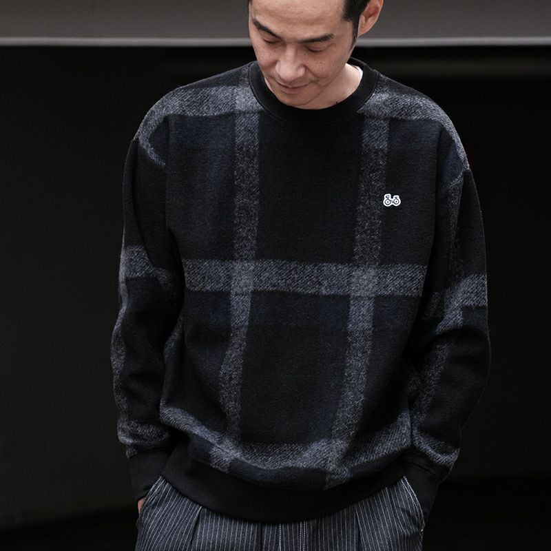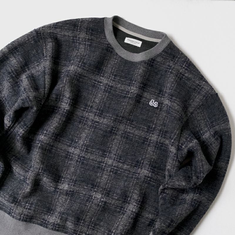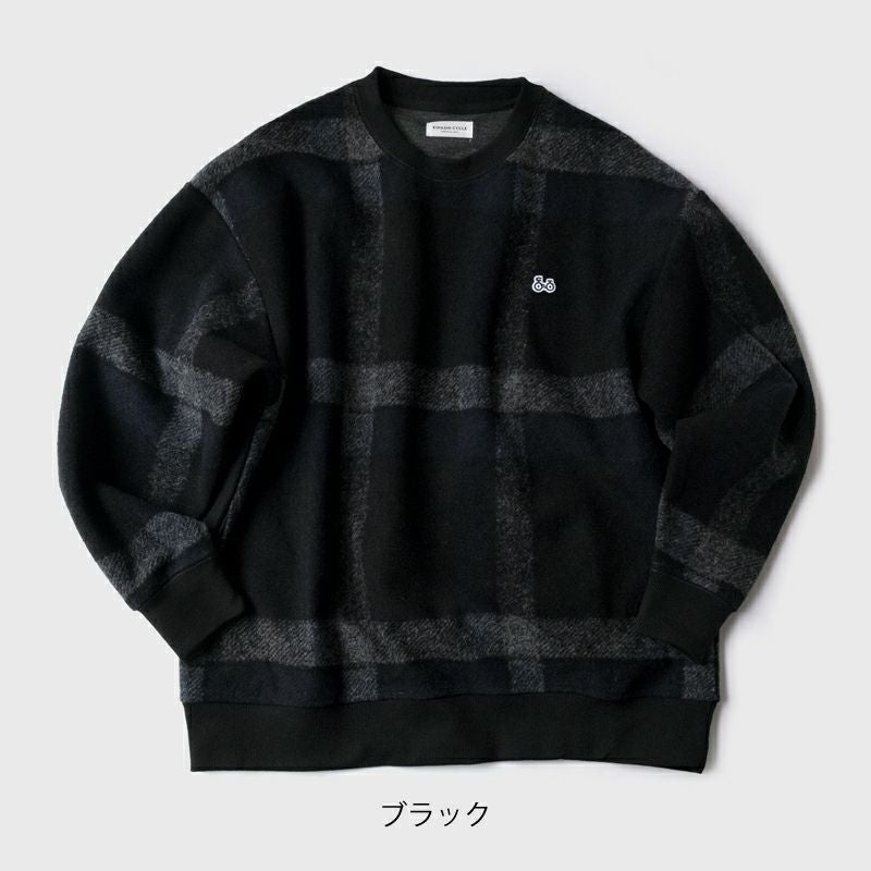 表地にはウールが入ったチェック柄の生地を、裏地にボンディング生地を使用したクルーネックの登場です。