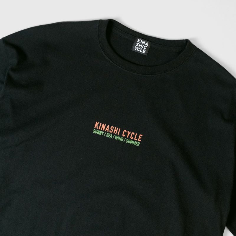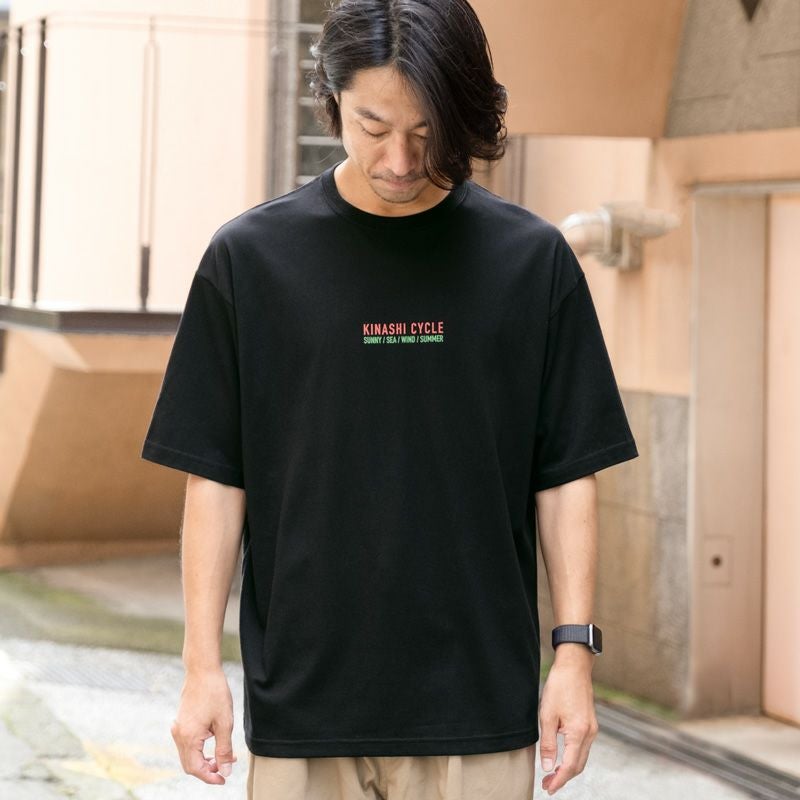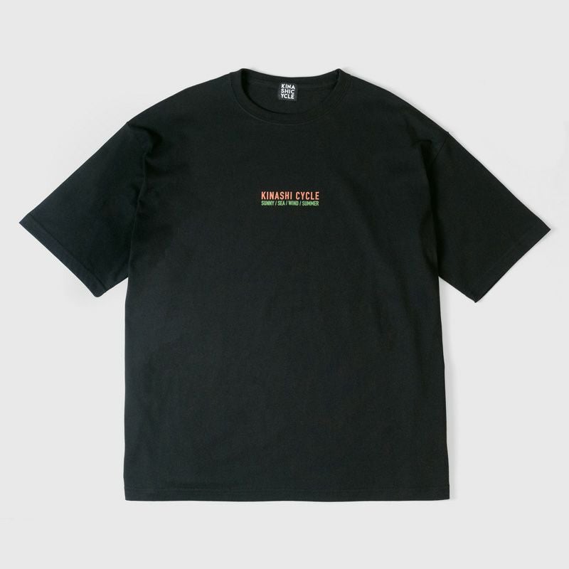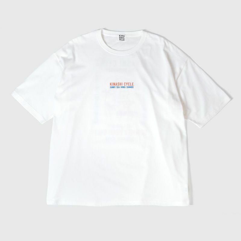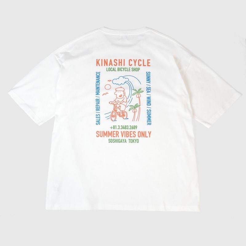 ビーチサイドを駆け抜けるイラストが、遊び心たっぷりのグラフィックTシャツ。