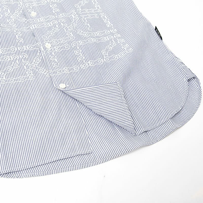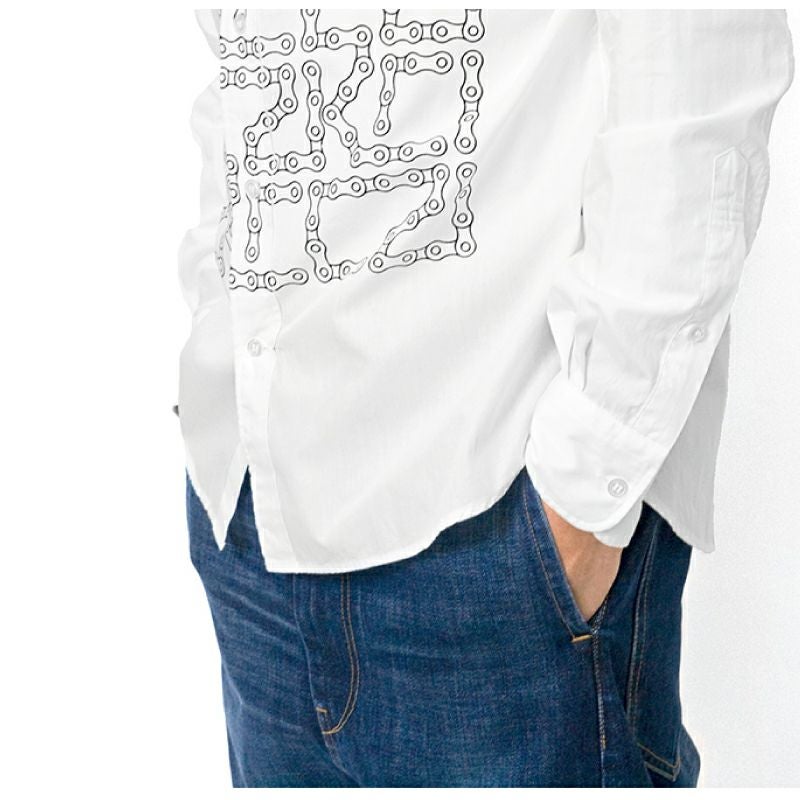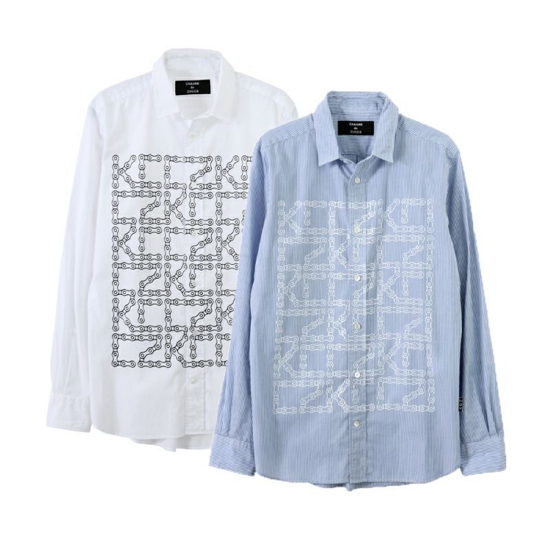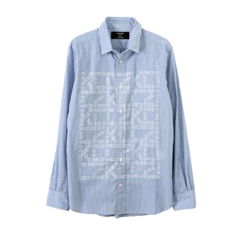 ベーシックなブロードシャツにKINASHI CYCLEとCABANE de ZUCCaのイニシャルを大胆にプリント。連なるように描かれたKC・CZの文字は、自転車のチェーンをイメージ。裾出しコーディネート時には、KCZのロゴネームでさりげなくアピールできちゃいます。小ぶりな襟とちょっと短めの着丈でカジュアルに着こなせます。