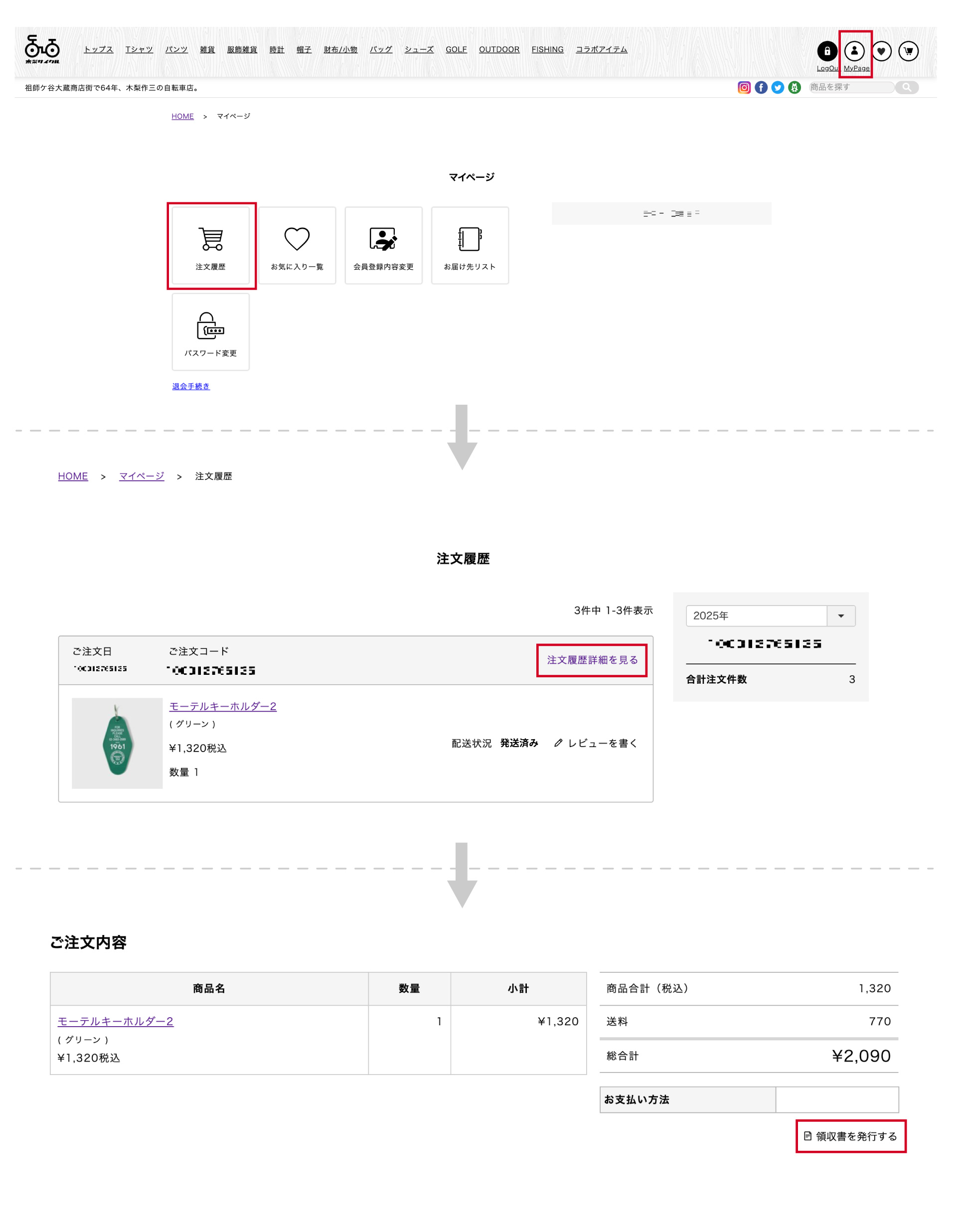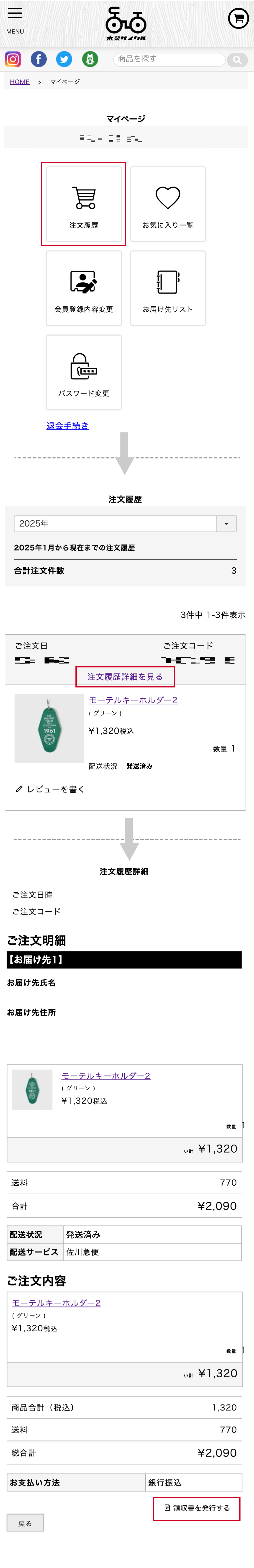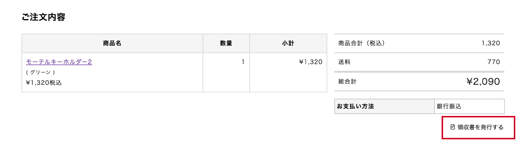 ②商品発送完了後、マイページ>注文履歴>注文履歴詳細画面より「領収書を発行する」ボタンが表示されます。